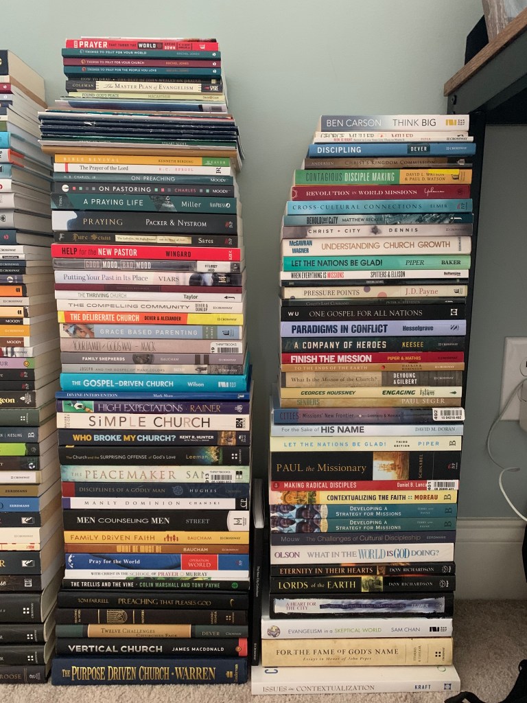 Here’s a list of some of the small books that are difficult to see at the top of the left stack: A Call to Prayer, J.C. Ryle (multiple copies); The Art of Turning, Kevin DeYoung; Killing Sin Habits, Stuart Scott; multiple mini-books by HarvestUSA on sex and sexuality; and multiple books from Stuart Scott: Anger, Anxiety, and Fear; Communication and Conflict Resolution; From Pride to Humility (multiple copies). Also, not pictured is 9Marks book on prayer.
