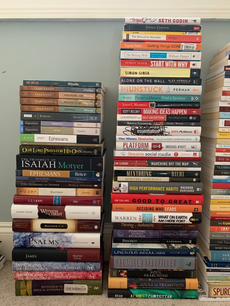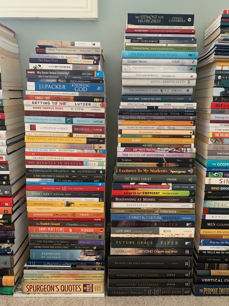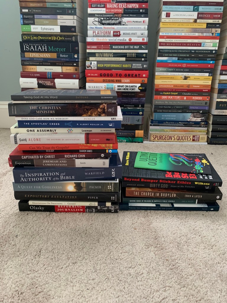 Here’s a list of books that I’m open to getting rid of/selling. I think 95% of them are good or great; I just prefer to have more of a digital library instead. Let me know which ones you’re interested in and I’ll shoot you a cost by taking 75% off the amazon price. I’m not opposed to shipping some of these to friends and family, but I’d rather just make these available to pick up from my house or Bob Jones University if possible.
